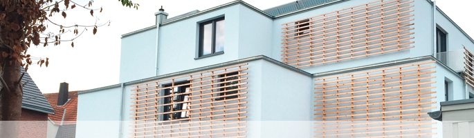 Neubau von fünf Wohnungen mit Südterrassen in Soest. Farb- und Lichtspiel durch Holzleisten auf hellblauem Putz. Das Gebäude wirkt bei blauem Himmel grau, bei grauem Himmel blau.