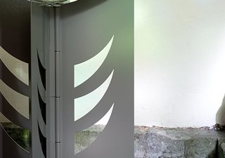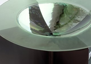 Vier um eine vierteilige Achse drehbare Aluminiumtafeln tragen eine von Hand geformte Glasschale.