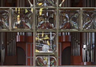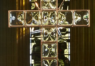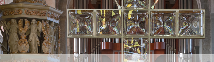 Eine heutige Interpretation des romanischen Triumphkreuzes – Edelstahl und gegossene Glaskuben.