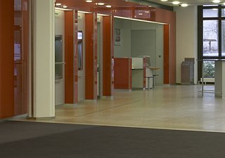 Ziel war die räumliche Umsetzung des Konzepts “integrierte Selbstbedienung”: Eine attraktive 24-Stunden-Zone für die tägliche Abwicklung sowie eine einladende großzügige Raumfolge für die Beratungsbereiche, beides verknüpft durch die “Service-Points”. Dabei entstand ein auch für z.B. kulturelle Zwecke angemessener Raum, der inzwischen vielfältig genutzt wird.